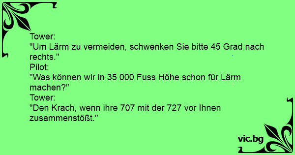 Torony: - Hogy ne csapjon túl nagy zajt, legyen szíves, forduljon 45 fokkal jobbra. Pilóta: - Milyen zajt csaphatnánk mi 35.000 láb magasan? Torony: - Olyan csörömpölőset, mint amikor a 707-esük...