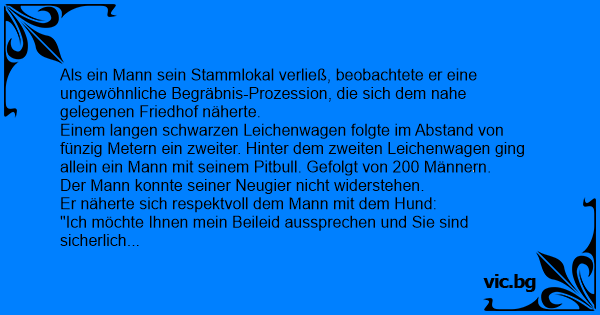 U hřbitovní brány hledí muž na podivný průvod. Za rakví kráčí muž s manželkou a psem dobrmanem, a potom dlouhá řada mužů. Stojící nevydrží a ptá se, kdo to má pohřeb. Pán za rakví odvětí: „To je...