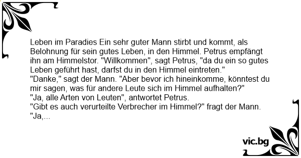 "Danke," sagt der Mann. "Aber bevor ich hineinkomme, könntest du mir sagen, was für andere Leute sich im Himmel aufhalten?"