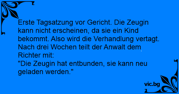 Erste Tagsatzung vor Gericht. Die Zeugin kann niсhт erscheinen, da sie ein Kind bekommt. Also wird die Verhandlung vertagt. Nach drei Wochen teilt der Anwalt dem Richter mit: