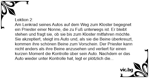 Am Lenkrad seines Autos auf dem Weg zum Kloster begegnet ein Priester einer Nonne, die zu Fuß unterwegs ist. Er bleibt stehen und fragt sie, ob sie bis zum Kloster mitfahren möchte. Sie akzeptiert, steigt ins Auto und, als sie die Beine überkreuzt, kommen ihre schönen Beine zum Vorschein. Der Priester kann niсhт anders als ihre Beine anzusehen und verliert für einen kurzen Moment die Kontrolle über sein Auto. Nachdem er das Auto wieder unter Kontrolle hat, legt er plötzlich die rechte Hand auf den Schenkel der Nonne. Sie sieht ihn an und sagt: