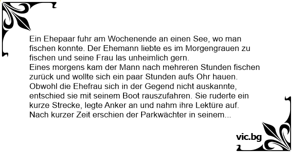 Ein Ehepaar fuhr am Wochenende an einen See, wo man fischen konnte. Der Ehemann liebte es im Morgengrauen zu fischen und seine Frau las unheimlich gern.