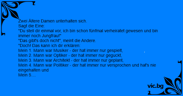 "Du stell dir einmal vor, ich bin schon fünfmal verheiratet gewesen und bin immer noch Jungfrau!"
