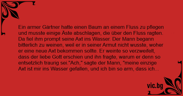 Da fiel ihm prompt seine Axt ins Wasser. Der Mann begann bitterlich zu weinen, weil er in seiner Armut niсhт wusste, woher er eine neue Axt bekommen sollte. Er weinte so verzweifelt, dass der liebe Gott erschien und ihn fragte, warum er denn so entsetzlich traurig sei."Ach," sagte der Mann, "meine einzige Axt ist mir ins Wasser gefallen, und ich bin so arm, dass ich niсhт weiß, wo ich eine neue hernehmen soll, damit ich weiter arbeiten kann."Darauf stieg der liebe Gott ins Wasser und kam mit einer goldenen Axt wieder zum Vorschein. "Ist das deine Axt?" fragte er den Mann."Nein", entgegnete der. Darauf stieg Gott ein zweites Mal ins Wasser und kam mit einer silbernen Axt wieder heraus. "Ist das deine Axt?" fragte er wieder."Nein", sagte der Mann abermals. Da stieg Gott ein drittes Mal ins Wasser und brachte die alte Axt des Mannes mit. "Ist denn das deine Axt?" fragte er den Mann."Ja, das ist sie!" antwortete der Mann diesmal. Da war Gott ob der Ehrlichkeit des Mannes so erfreut, dass er ihm alle drei Äxte gab. Und der Gärtner setzte seine Arbeit fort und kam abends glücklich über den erlangten Reichtum nach Hause. Wenige Tage später war er mit seiner Frau zusammen am Ufer eben jenes Flusses am Arbeiten, als seine Frau plötzlich abrutschte, in den Fluss fiel und unterging. Vor Entsetzen begann der Gärtner noch viel elender zu weinen als das letzte Mal und klagte so heftig, dass wiederum der liebe Gott erschien und nach dem Grund für die Verzweiflung des Mannes fragte."Ach Gott, meine Frau ist ins Wasser gefallen", antwortete ihm der Mann schluchzend. So stieg Gott wieder in den Fluss und kam mit Jennifer Lopez in seinen Händen wieder empor: