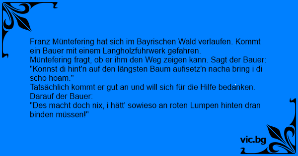 Franz Müntefering hat sich im Bayrischen Wald verlaufen. Kommt ein Bauer mit einem Langholzfuhrwerk gefahren.