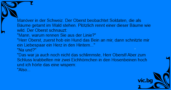 Manöver in der Schweiz. Der Oberst beobachtet Soldaten, die als Bäume getarnt im Wald stehen. Plötzlich rennt einer dieser Bäume wie wild. Der Oberst schnauzt: