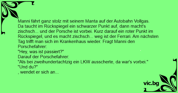 Da taucht im Rückspiegel ein schwarzer Punkt auf, dann macht's zischsch... und der Porsche ist vorbei. Kurz darauf ein roter Punkt im Rückspiegel, und es macht zischsch... weg ist der Ferrari. Am nächsten Tag trifft man sich im Krankenhaus wieder. Fragt Manni den Porschefahrer: