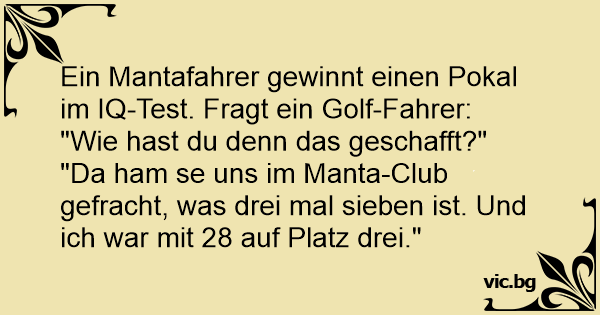 Ein Mantafahrer gewinnt einen Pokal im IQ-Test. Fragt ein Golf-Fahrer: