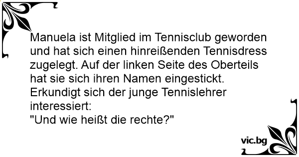 Manuela ist Mitglied im Tennisclub geworden und hat sich einen hinreißenden Tennisdress zugelegt. Auf der linken Seite des Oberteils hat sie sich ihren Namen eingestickt.