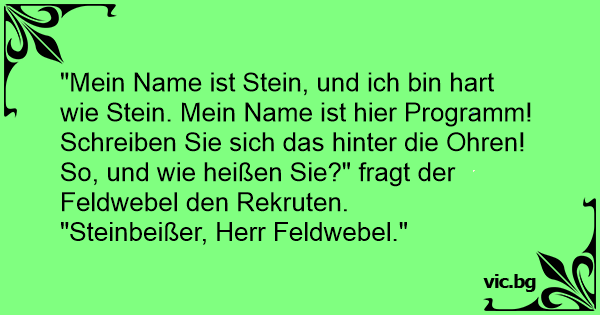 "Mein Name ist Stein, und ich bin hart wie Stein. Mein Name ist hier Programm! Schreiben Sie sich das hinter die Ohren! So, und wie heißen Sie?" fragt der Feldwebel den Rekruten.