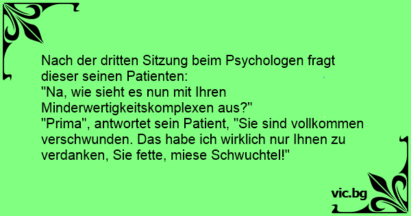 "Prima", antwortet sein Patient, "Sie sind vollkommen verschwunden. Das habe ich wirklich nur Ihnen zu verdanken, Sie fette, miese Sсhwuсhтеl!"
