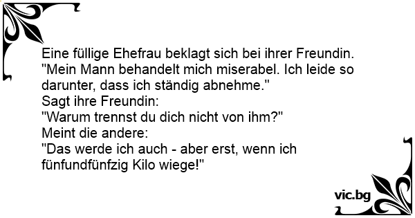 Eine füllige Ehefrau beklagt sich bei ihrer Freundin. "Mein Mann behandelt mich miserabel. Ich leide so darunter, dass ich ständig abnehme."