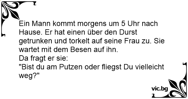 Ein Mann kommt morgens um 5 Uhr nach Hause. Er hat einen über den Durst getrunken und torkelt auf seine Frau zu. Sie wartet mit dem Besen auf ihn.
