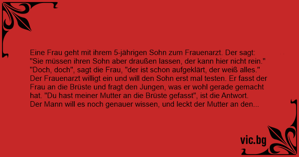 Der Frauenarzt willigt ein und will den Sohn erst mal testen. Er fasst der Frau an die Brüste und fragt den Jungen, was er wohl gerade gemacht hat. "Du hast meiner Mutter an die Brüste gefasst", ist die Antwort.