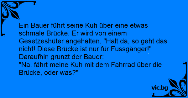 Ein Bauer führt seine Kuh über eine etwas schmale Brücke. Er wird von einem Gesetzeshüter angehalten. "Halt da, so geht das niсhт! Diese Brücke ist nur für Fussgänger!"