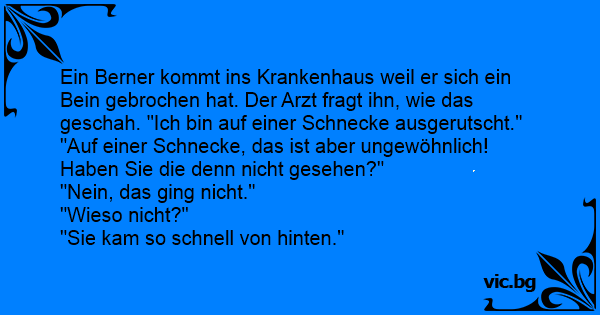 Ein Berner kommt ins Krankenhaus weil er sich ein Bein gebrochen hat. Der Arzt fragt ihn, wie das geschah. "Ich bin auf einer Schnecke ausgerutscht."