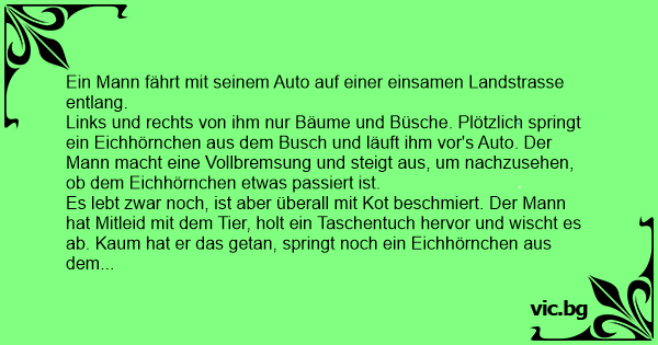 Links und rechts von ihm nur Bäume und Büsche. Plötzlich springt ein Eichhörnchen aus dem Busch und läuft ihm vor's Auto. Der Mann macht eine Vollbremsung und steigt aus, um nachzusehen, ob dem Eichhörnchen etwas passiert ist.