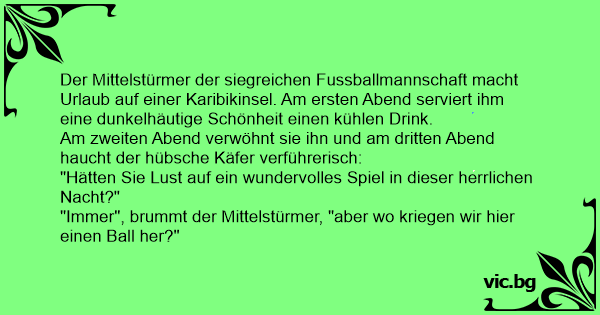 Der Mittelstürmer der siegreichen Fussballmannschaft macht Urlaub auf einer Karibikinsel. Am ersten Abend serviert ihm eine dunkelhäutige Schönheit einen kühlen Drink.