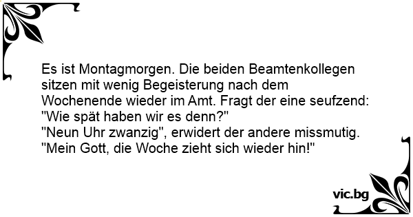 Es ist Montagmorgen. Die beiden Beamtenkollegen sitzen mit wenig Begeisterung nach dem Wochenende wieder im Amt. Fragt der eine seufzend: