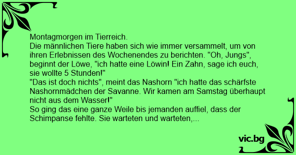 Die männlichen Tiere haben sich wie immer versammelt, um von ihren Erlebnissen des Wochenendes zu berichten. "Oh, Jungs", beginnt der Löwe, "ich hatte eine Löwin! Ein Zahn, sage ich euch, sie wollte 5 Stunden!"