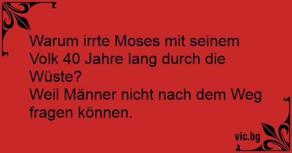 Moses Hvorfor vandrede Moses i ørkenen i 40 år? – Han ville ikke spørge om vej. Håber du kunne lide disse jokes/vittigheder om jøder. Sidder du inde med en eller flere er du velkommen til at sende...