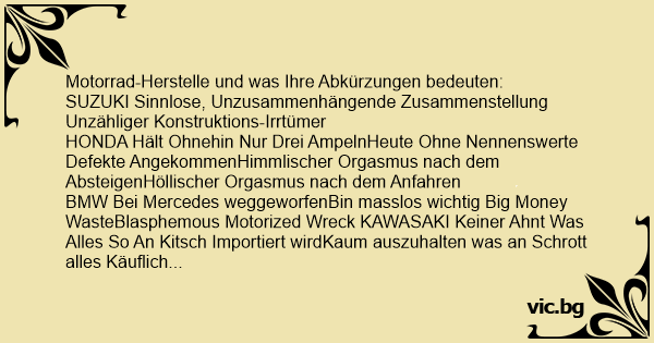 BMW Bei Mercedes weggeworfenBin masslos wichtig Big Money WasteBlasphemous Motorized Wreck KAWASAKI Keiner Ahnt Was Alles So An Kitsch Importiert wirdKaum auszuhalten was an Schrott alles Käuflich istKaum auszuhalten was alles so am Klappern istKein Ankommen weil alles so aussergewoehnlich kompliziert ist