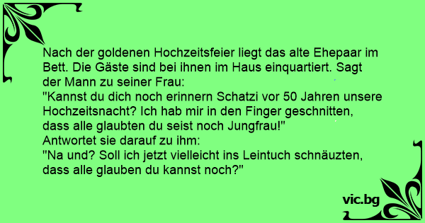 "Kannst du dich noch erinnern Schatzi vor 50 Jahren unsere Hochzeitsnacht? Ich hab mir in den Finger geschnitten, dass alle glaubten du seist noch Jungfrau!"