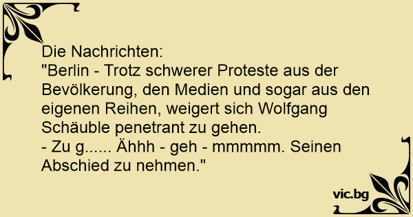 "Berlin - Trotz schwerer Proteste aus der Bevölkerung, den Medien und sogar aus den eigenen Reihen, weigert sich Wolfgang Schäuble penetrant zu gehen.