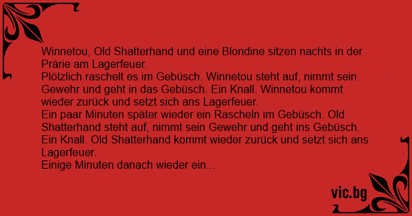 Einige Minuten danach wieder ein Rascheln im Gebüsch. Die Blondine steht auf, nimmt ihr Gewehr und geht ins Gebüsch. Ein Knall. Noch ein Knall. Da sagt Old Shatterhand zu Winnetou: