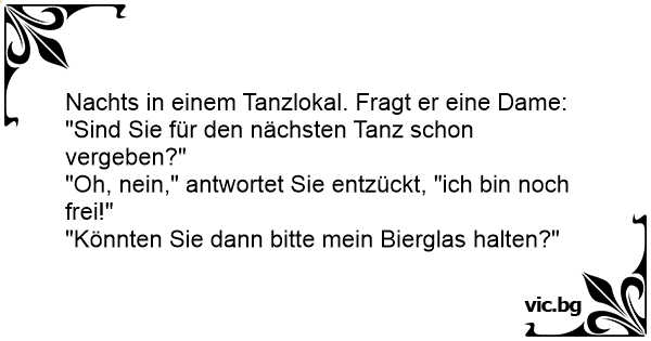 Er: "Entschuldigung, sind sie schon für den nächsten Tanz vergeben?" Sie erwartungsvoll: "Aber nein! Ich bin noch frei!" Er: "Könnten sie dann bitte mein Bier halten?"