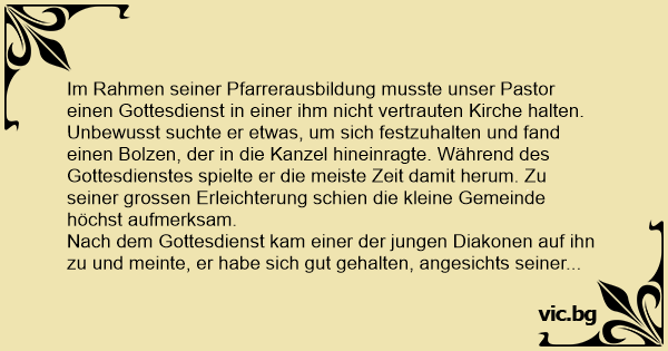 Im Rahmen seiner Pfarrerausbildung musste unser Pastor einen Gottesdienst in einer ihm niсhт vertrauten Kirche halten. Unbewusst suchte er etwas, um sich festzuhalten und fand einen Bolzen, der in die Kanzel hineinragte. Während des Gottesdienstes spielte er die meiste Zeit damit herum. Zu seiner grossen Erleichterung schien die kleine Gemeinde höchst aufmerksam.
