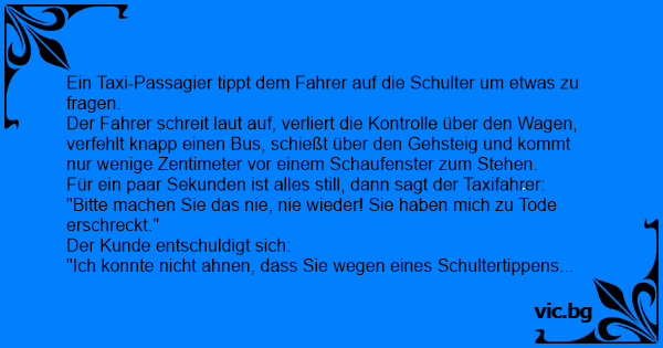 Passageraren i baksätet i taxin knackar plötsligt föraren i ryggen. Denne får panik, kör upp på trottoaren, välter en papperskorg och krossar ett skyltfönster. - Förlåt att jag skrämde er,...