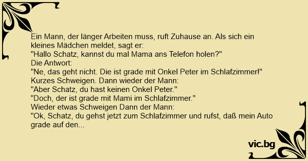 - Ало? - Здравей, миличко, обажда се татко. Мама близо до телефона ли е? - Не, тате. Тя е горе в спалнята с чичо Гошо. След кратка пауза таткото казва: - Но ти нямаш чичо с име Гошо, миличко! - О, да, имам и той е горе в спалнята с мама в момента! - Ъ, добре тогава... ето какво искам да направиш....