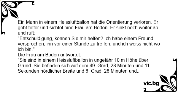 Zwei Ballonfahrer haben sich im Nebel mit ihrem Ballon verirrt. Plötzlich taucht im Nebel ein 2. Ballon auf mit einer Person an Bord. Da ruft einer der beiden Verirrten: " Hallo, können Sie uns sagen, wo wir uns befinden?" Der andere Ballonfahrer gibt keine Antwort. Kurz bevor die Ballone ausser...