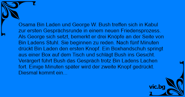 Als George sich setzt, bemerkt er drei Knöpfe an der Seite von Bin Ladens Stuhl. Sie beginnen zu reden. Nach fünf Minuten drückt Bin Laden den ersten Knopf. Ein Boxhandschuh springt aus einer Box auf dem Tisch und schlägt Bush ins Gesicht. Verärgert führt Bush das Gespräch trotz Bin Ladens Lachen fort. Einige Minuten später wird der zweite Knopf gedrückt. Diesmal kommt ein großer Fuß aus dem Tisch heraus und tritt Bush gegen das Schienbein. Wieder lacht Bin Laden und Bush führt das Gespräch fort, um das Friedensgespräch mit den Al Quaida niсhт aufs Spiel zu setzen. Doch als der dritte Knopf gedrückt wird, fährt ein anderer Stiefel heraus und tritt Bush in sein bestes Stück. Nun hat er genug. "Ich reise zurück nach Washington!" sagt er ruhig. "Wir werden diese Gespräche in zwei Wochen in Washington beenden!"