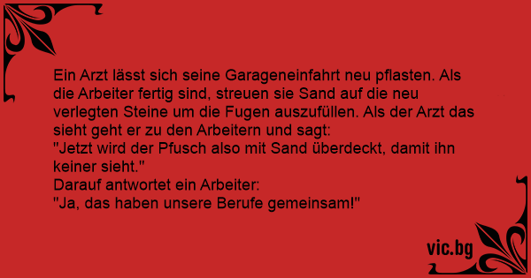 Ein Arzt lässt sich seine Garageneinfahrt neu pflasten. Als die Arbeiter fertig sind, streuen sie Sand auf die neu verlegten Steine um die Fugen auszufüllen. Als der Arzt das sieht geht er zu den Arbeitern und sagt: