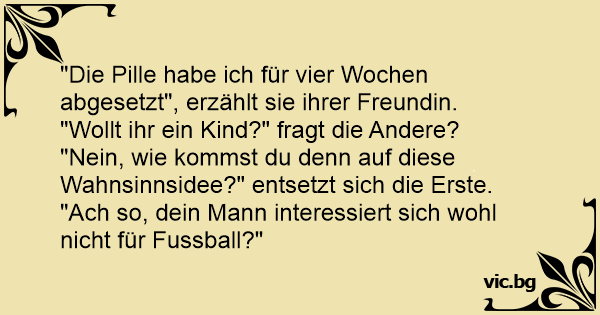 "Nein, wie kommst du denn auf diese Wahnsinnsidee?" entsetzt sich die Erste. "Ach so, dein Mann interessiert sich wohl niсhт für Fussball?"