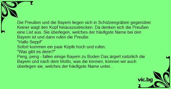 Keiner wagt den Kopf hinauszustrecken. Da denken sich die Preußen eine List aus. Sie überlegen, welches der häufigste Name bei den Bayern ist und dann rufen die Preuße: