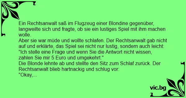 Ein Rechtsanwalt saß im Flugzeug einer Blondine gegenüber, langweilte sich und fragte, ob sie ein lustiges Spiel mit ihm machen wolle.