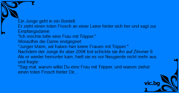 Едно момченце около 12 годишно си ходи по улицата и влачи прегазена жаба на връвчица. Един мъж отишъл в публичен дом да търси проститутка болна от СПИН. След като преспали, на сутринта той попитал: - Докторе, искам да ма заразиш с неква... ама много страшна венерическа болест!!! Ein Junge kommt mit einem toten Frosch ins Bordell. Dort fragt er nach einer Dame mit irgendeiner ansteckenden Krankheit. Die Puffmutter meint: A kid is walking down the street with a jar of money and dragging along a dead frog on a string. En kille på runt tolv år är ute och går i Amsterdams Red Light District. Han släpar en död, tillplattad groda på ett rep efter sig. Han stannar till vid en av barerna och frågar madame: - Jag vill ha sex med en av era flickor. Jag vet att jag är för... Un jour, un petit garçon de douze ans rentre dans une maison close en tenant dans ses bras une grenouille morte. Il s'adresse à la mère maquerelle : "Je veux une de vos filles" et il pose un billet de 500 FF sur le comptoir. La tenancière le regarde... Jantje ( 11 jaar ) loopt op straat met een dood hondje aan een touw. Hij loopt de hoerenstraat in en vraagt aan een pooier ik wil een hoer neuken met een geslachtsziekte.De pooier roept een... Um garoto de 12 anos entra num bordel arrastando um gato morto por um barbante. Coloca uma nota de 50 no balcão e diz: — Quero uma mulher! A cafetina, olhando para ele, responde: — Você não acha... Lille Pelle, 10 år, går in på byns horhus med en platt död groda efter sig i ett snöre. Han talar med värdinnan och säger: - Jag skulle vilja ha en flicka! Värdinnan blir förvånad och säger: -... En liten 12-årig kille, som släpade på en tillplattad död groda kopplad i ett snöre, gick in på horhuset i den lilla byn. Han sa till bordellmamman: - Jag vill ha sex med en av tjejerna. Jag har... En liten pojke kommer in på stadens bordell släpandes på en död groda i ett koppel. Bordellmamman frågar snällt: - Vad kan en sådan liten gosse vilja då? Pojken halar fram sin lilla portmonä,...
