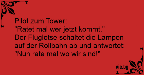 Mladý pilot, strašný frajer, jde na svoje první samostatné noční přistání. Na místo obvyklého hlášení se dispečerovi letiště zahlásí do vysílačky: „Hádej kdo?” Dispečer vypne světla na celé...