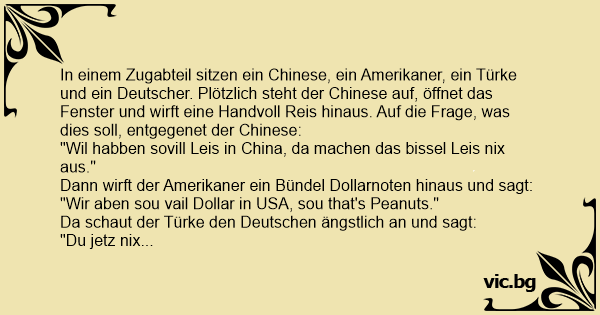 Sitzen ein Deutscher, ein Chinese, ein Amerikaner und ein Türke im Zug. Nach einer halben Stunde schmeißt der Amerikaner sein Essen aus dem Fenster und sagt: " Ich hab keine Lust mehr auf diesen Fast Food Scheiß!" Eine viertel Stunde später schmeißt der Chinese seinen Laptop und MP3 Player raus:...