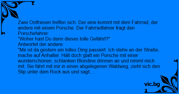 Zwei Ostfriesen treffen sich. Der eine kommt mit dem Fahrrad, der andere mit einem Porsche. Der Fahrradfahrer fragt den Porschefahrer: