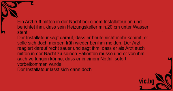 Der Installateur sagt darauf, dass er heute niсhт mehr kommt, er solle sich doch morgen früh wieder bei ihm melden. Der Arzt reagiert darauf recht sauer und sagt ihm, dass er als Arzt auch mitten in der Nacht zu seinen Patienten müsse und er von ihm auch verlangen könne, dass er in einem Notfall sofort vorbeikommen würde.