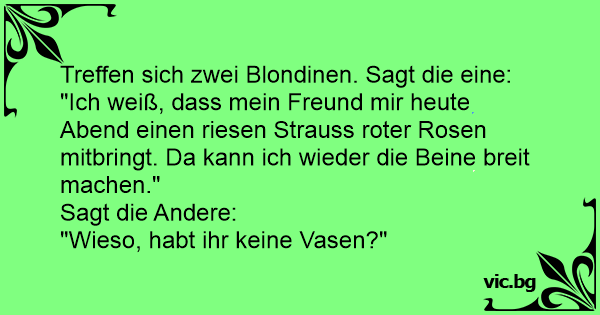 Blondiner og blomster En brunette og en blondine sad og snakkede. Brunetten sagde: "Øv, jeg har fået blomster af min kæreste, nu forventer han jeg ligger med spredte ben hele weekenden." Blondinen...