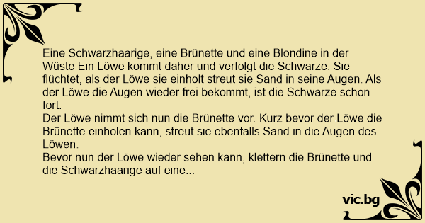 Eine Schwarzhaarige, eine Brünette und eine Blondine in der Wüste Ein Löwe kommt daher und verfolgt die Schwarze. Sie flüchtet, als der Löwe sie einholt streut sie Sand in seine Augen. Als der Löwe die Augen wieder frei bekommt, ist die Schwarze schon fort.