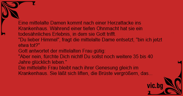 In His Image Αγνώριστη Лежи една жена в реанимацията, почти умира… Внезапно чува глас небесен: A 45 year old woman had a heart attack and was immediately transported to the hospital. Eine mittelalte Frau hatte einen Herzanfall und wurde zum Spital gebracht. Wie sie am Operationstisch lag, hatte sie eine "Todesnahe Erfahrung". Sie sieht Gott und fragt ihn: "Ist mein Leben aus?" Gott sagt: "Nein, du hast noch 43 Jahre, 2 Monate und 8 Tage zum Leben." Nach der Herzoperation... Uma mulher foi levada às pressas para a UTI de um Hospital. Lá chegando, teve uma experiência de quase-morte. E, neste estado, encontrou-se com Deus: - — O que é isso? — perguntou ao Criador. — Eu morri? — Não, pelos meus cálculos, você morrerá daqui a 43 anos, 8 meses, 9 dias e 16 horas —... Een vrouw van 46 krijgt een hartaanval en ligt in het hospitaal. Terwijl ze op de operatietafel ligt, dichtbij de dood, krijgt ze een visioen. Ze ziet God en vraagt: "is mijn uur gekomen?" God... Kadının biri çok sağlıklıyken birgün kalp krizi geçirir ve acilen ameliyata alırlar ameliyat esnasında rüya görür ve rüyasında şeytanı görür ve şeytana sorar: - kaç yıllık ömrüm kaldı. diye... C'est une vieille dame de 75 ans qui a une vision une nuit, elle voit Dieu et lui parle. Elle lui demande : "Combien de temps me reste-t-il à vivre?" Dieu lui répond: "Il te reste encore 35 ans à... A middle aged woman had a heart attack and was taken to the hospital. While on the operating table she had a near death experience. Seeing God, she asked if this was it. God said, 'No you have... In surgery for a heart attack, a middle-aged woman has a vision of God by her bedside. “Will I die?” she asks. God says, “No. You have 30 more years to live.” With 30 years to look forward to, she... Llevan a Emily de emergencia al hospital pues ha sufrido un paro cardíaco. La llevan de inmediato al quirófano, y en medio de la operación, Emily tiene una experiencia de ultratumba. Se ve así... Una mujer de 27 años, estaba en una clínica, había caído en coma y 15 días después murió. Nadie en la clínica se había dado cuenta ya que había fallecido repentinamente. La mujer en el cielo habló... Unei babe ii apare Dumnezeu in vis si ii spune ca o sa mai traiasca 35 de ani. A doua zi baba merge la o clinica de chirurgie estetica si isi face lifting facial, isi pune silicoane si se vopseste... Był sobie facet bardzo brzydki, ale uczciwy. Żył bardzo bogobojnie, ale cierpiał z powodu brzydoty. Kiedy był już w średnim wieku, nagle wpadł na pomysł, żeby zrobić sobie operację plastyczną.... Una giovane donna si ammala e deve essere sottoposta ad un difficile intervento chirurgico. Durante l'operazione vede Dio e gli chiede: "Morirò?" Dio la tranquillizza: "Non ti preoccupare, ti... Una donna di 70 anni va in paradiso e Dio gli dice: "Facciamo così... Ti rimando indietro di 35 anni così hai ancora degli anni a disposizione" La donna ringrazia il Signore e torna sulla terra....