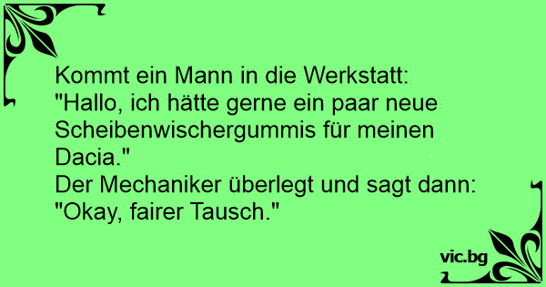 An der Tankstelle: "Ich hätte gern zwei Scheibenwischer für meinen Trabant." Antwort: "Guter Tausch!" Ein Trabbi-Besitzer an der Tankstelle zum Tankwart: "Für meinen Trabbi hätte ich gerne zwei Scheibenwischer." Darauf der Tankwart: "Das ist okay, das finde ich einen fairen Tausch!" Мъж в магазин за авточасти: Komt een man bij de garage met z'n Lada. Man: Ik wil graag twee nieuwe ruitenwissers voor m'n Lada. Garage monteur: Ja, da's een goede ruil, ok. Lada-rijder bij de garage: "Een achteruitkijkspiegeltje voor mijn Lada, a. U. B! " Verkoper: "Oke, dat is een eerlijke ruil!" Kommt ein Trabibesitzer in eine Autowerkstatt. „Ich hätte gern 2 Scheibenwischer für meinen Trabi“. Meint der Werkstattbesitzer: „Ein fairer Tausch“. Dans une station-service, un mec demande à la caisse : - Pourrais-je avoir un jerricane d'essence pour ma Renault ? - Oui... Cela me parait être un bon troc. A guy walks into an auto shop and says, "I'd like a gas cap for my KIA." The car mechanic thinks for a few seconds then says, "Ok, that seems like a fair trade."