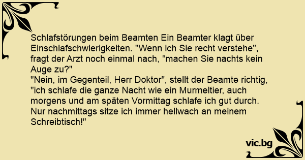Schlafstörungen beim Beamten Ein Beamter klagt über Einschlafschwierigkeiten. "Wenn ich Sie recht verstehe", fragt der Arzt noch einmal nach, "machen Sie nachts kein Auge zu?"