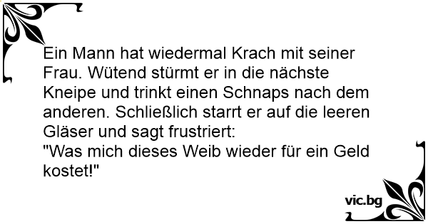 Ein Mann hat wiedermal Krach mit seiner Frau. Wütend stürmt er in die nächste Kneipe und trinkt einen Schnaps nach dem anderen. Schließlich starrt er auf die leeren Gläser und sagt frustriert: